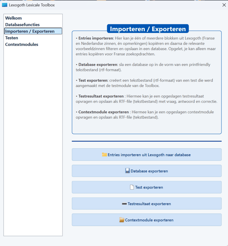 Flexibel, offline en compleet Lexogoth is zeer gebruiksvriendelijk en werkt volledig offline, wat het ideaal maakt voor instructiemomenten in de klas. De interface is uiterst flexibel: voer zoekopdrachten uit in het Frans of Nederlands via het zoekveld of het klassieke woordenboek. Als extra ondersteuning bieden we een module voor werkwoordvervoeging en een uitgebreid pakket van circa 90 lessen (niveau ERK A-B) onder de vorm van overzichtelijke PDF’s.